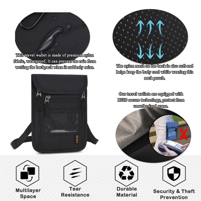 - High Quality Material: This travel wallet is made of premium nylon fabric, which is durable and lightweight. Exquisite stitched seams will last a good long time. The nylon mesh on the back is also soft and helps keep the body cool while wearing this neck pouch.