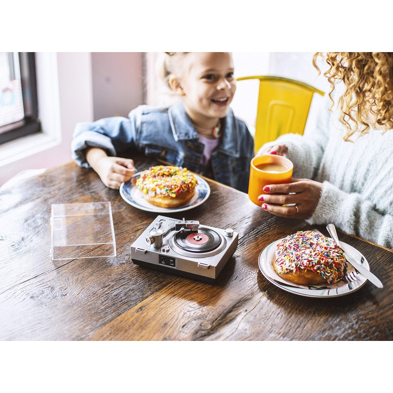 - Belt-driven Turntable mechanism plays 3-inch records