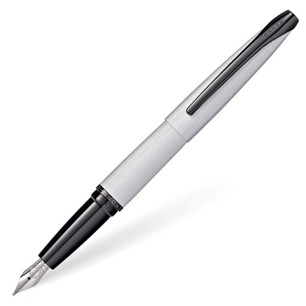 - Box contents: Cross ATX fountain pen in brushed chrome, nib size F = fine, 2 black ink cartridges (#8921), in premium gift packaging