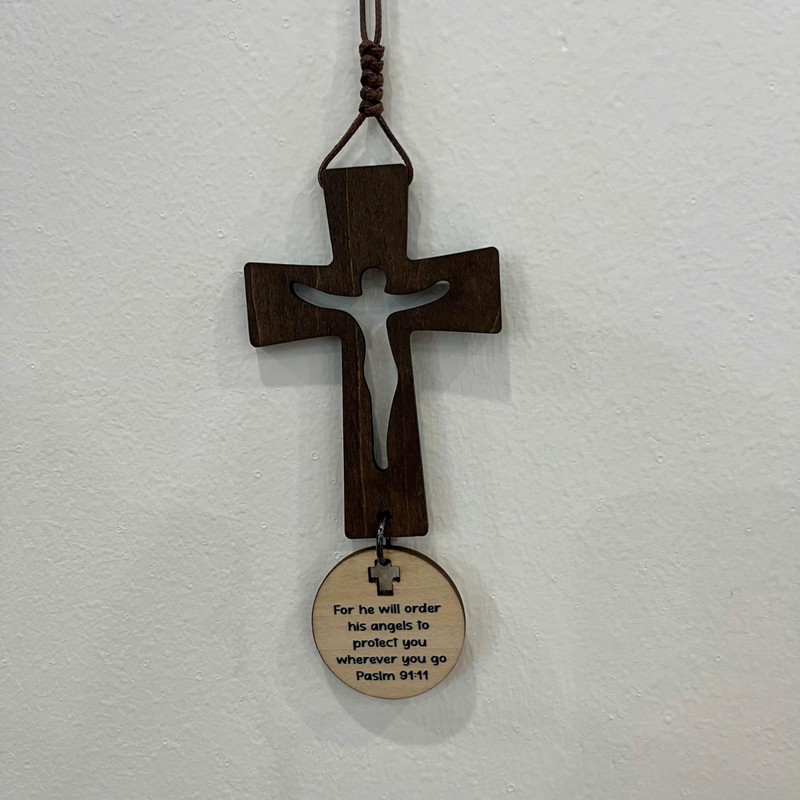 • Cross for Car Mirror Hanging: Wooden cross ornament with the silhouette of Jesus in the center, designed to inspire faith and protection on every journey.