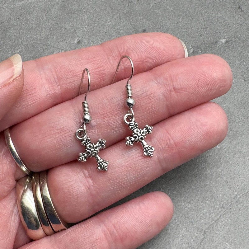 - Small and delicate ornate Tibetan silver cross charms in a Celtic inspired design, mounted on nickel free antique silver tone hooks.
