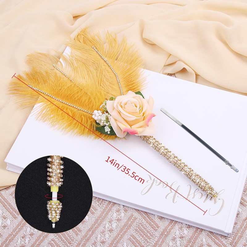- Unique Design, Show Your Personality : The CROWN GUIDE feather pen, with a length of 37cm/14.5 inches and an exquisite design, is an excellent choice for personalized wedding guest book pens. Its unique decoration of ostrich feathers, artificial roses, green leaves and shiny rhinestones makes it stand out among numerous pens and adds a unique aesthetic touch to your desk.