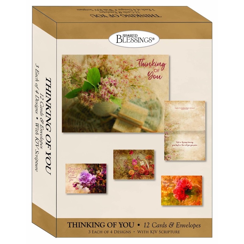- THINKING OF YOU CARDS WITH ENVELOPES - Includes 12 boxed thinking of you cards with envelopes, featuring 3 each of 4 different antique floral designs with KJV scripture. Perfect for sending messages of encouragement or friendship.
