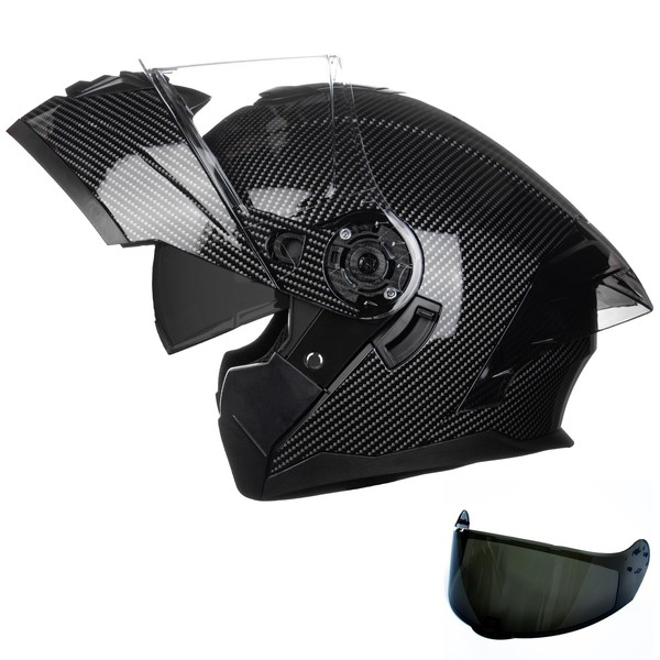 Crown Racing Modular Motorcycle Helmet with Flip-Up Design, Carbon Fiber Pattern, with Extra Clear Visor, DOT Approve Full Face Helmets