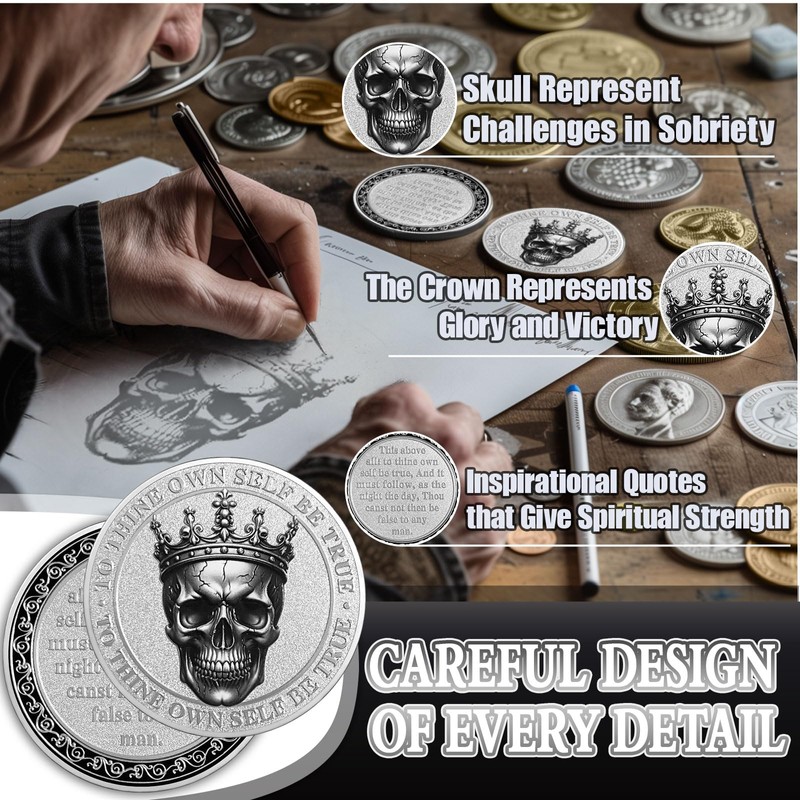 - TO THINE OWN SELF BE TRUE: The crowned skull designed for this sobriety coin, as well as the Shakespeare quote on the reverse, convey a dignified and profound spiritual power. This sober coin is a triumph of our sobriety process in gaining rebirth and overcoming addiction; and an important expression of our ability to maintain self-honesty and moral fortitude. The AA coin is both a memorial to our journey to sobriety and an important sobriety motivational tool