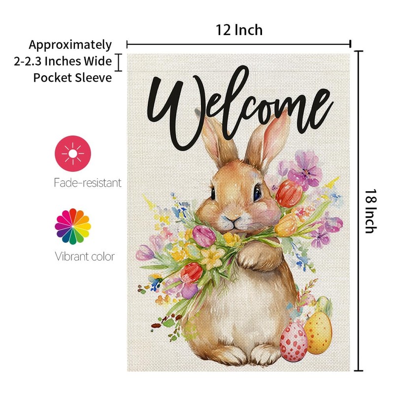 - Package Includes: Only 1PC small Easter garden flag (flag pole not included). Measures 12 x 18 inches with a 2-inch sleeve hanger fitting most standard flag stands. The flag is hand-sewn and measured; please allow +/- 1cm tolerance