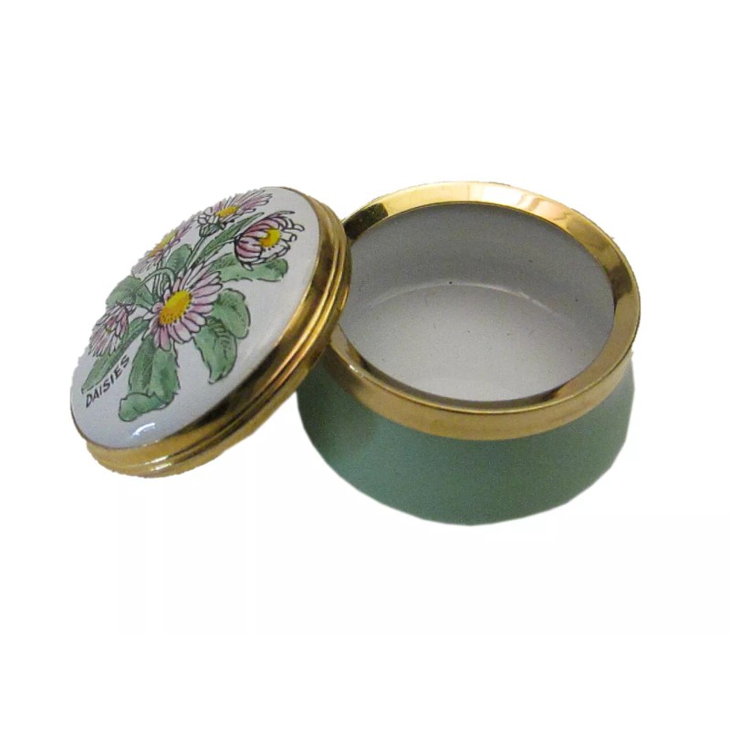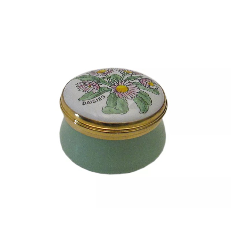 Crummles Enamels English Handpainted Round Enamel box with Lift off lid- Daisies for October