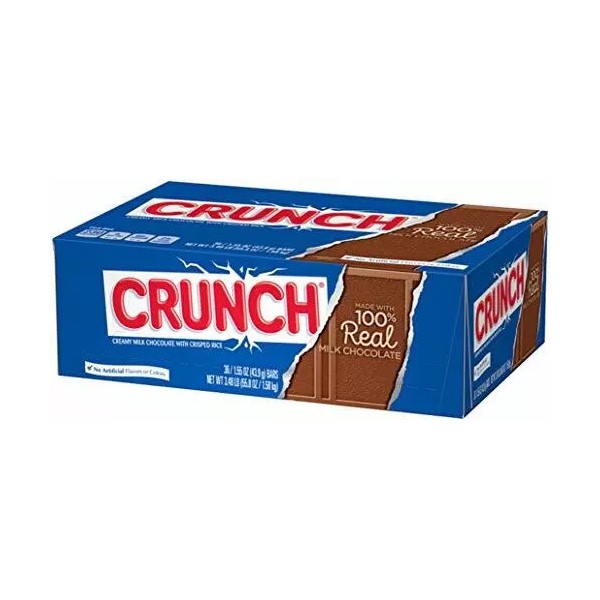 • CLASSIC CHOCOLATE BAR: This Crunch bar features light, airy rice crispies covered in rich, creamy milk chocolate, a sweet and familiar treat in an original full size bar | PERFECT FOR SHARING: With 36 full sized, individually wrapped candy bars, this pack is perfect for party favors, or your home or office | FULL SIZE ANYTIME TREAT: These full size candy bars make the perfect anytime treat. They're easy to eat & easy to share! Break off a piece to share with a friend, or take one with you for a post lunch snack | A TASTE FOR THE DIFFERENT: WeÕre passionate about the classic American chocolate of Crunch bars, adding a touch of enjoyment into every day with flavor so good we canÕt contain it | STOCK UP ON SWEETNESS: Stock up your pantry or candy dish with these delectable treats for holidays, event party favors, office treats, everyday snacking, kids' party gift bags and more