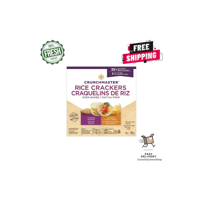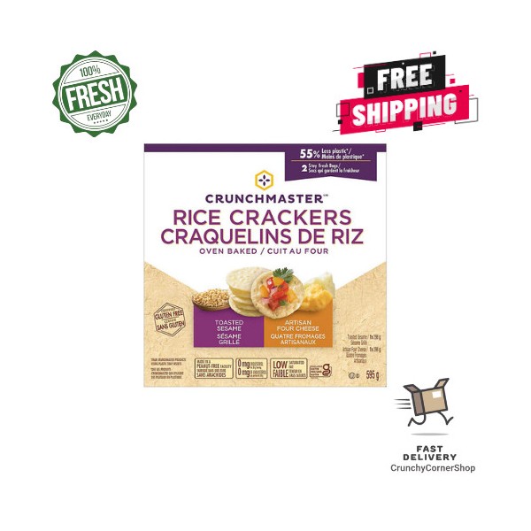 Indulge in the delightful experience of Crunchmaster Baked Rice Crackers, available in two enticing flavors: Artisan Four Cheese and Toasted Sesame. These certified gluten-free crackers offer a satisfying crunch that can be paired with your favorite dips and toppings, making them an ideal snack. They also serve as a perfect addition to charcuterie boards when entertaining guests. The 21-oz box contains two separate bags, one of each flavor, ensuring your crackers remain fresh and crunchy with every bite.