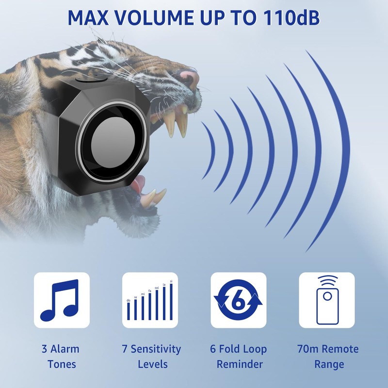 - 110 dB alarm system: 110 dB alarm system to deter theft and notification of unauthorised movement. The 3D motion sensor triggers the alarm when motion is detected. 3-level volume adjustable / 7-level sensitivity adjustable.