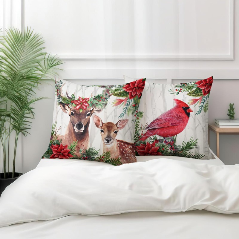 Cryfox Xmas Deer Cardinal Pillow Cover Set of 2 Christma Holiday Pillow Cases 18x18 Inch Winter Flowers Pillow Cover Cushion Case Xmas Home Decor for Couch Bed Sofa