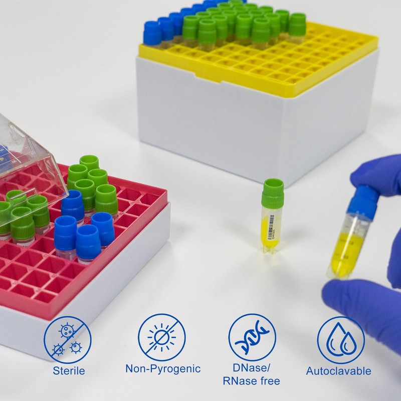- FEATURES - Clear vials with black graduation marks and white writing area for easy labeling; Sterilisation and free from RNase, DNase, endotoxin, and foreign DNA for reliable experiments; Stable from -196℃ to 121℃