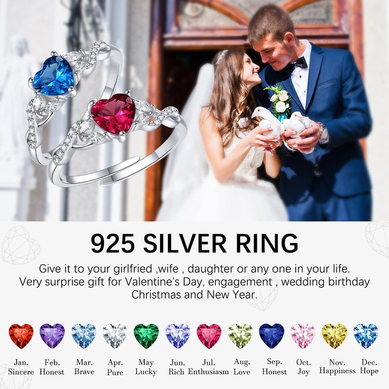 CRYSLOVE Birthstone Ring 925 Sterling Silver Adjustable Open Heart Gemstone Ring Engagement Wedding Promise Infinity Ring Jewelry Gifts for Women Wife Grandma