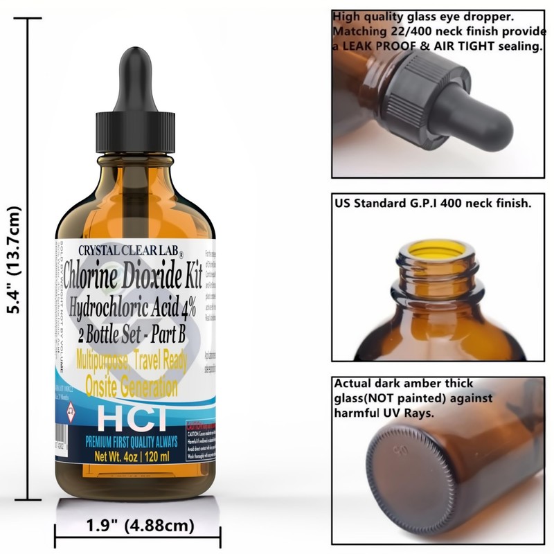 Crystal Clear Lab Chlorine Dioxide Kit | Hydrochloric Acid 4-5% (HCl) : Sodium Solution for Travel 2 Part A and B, 4 Fl Oz, Pack of 2