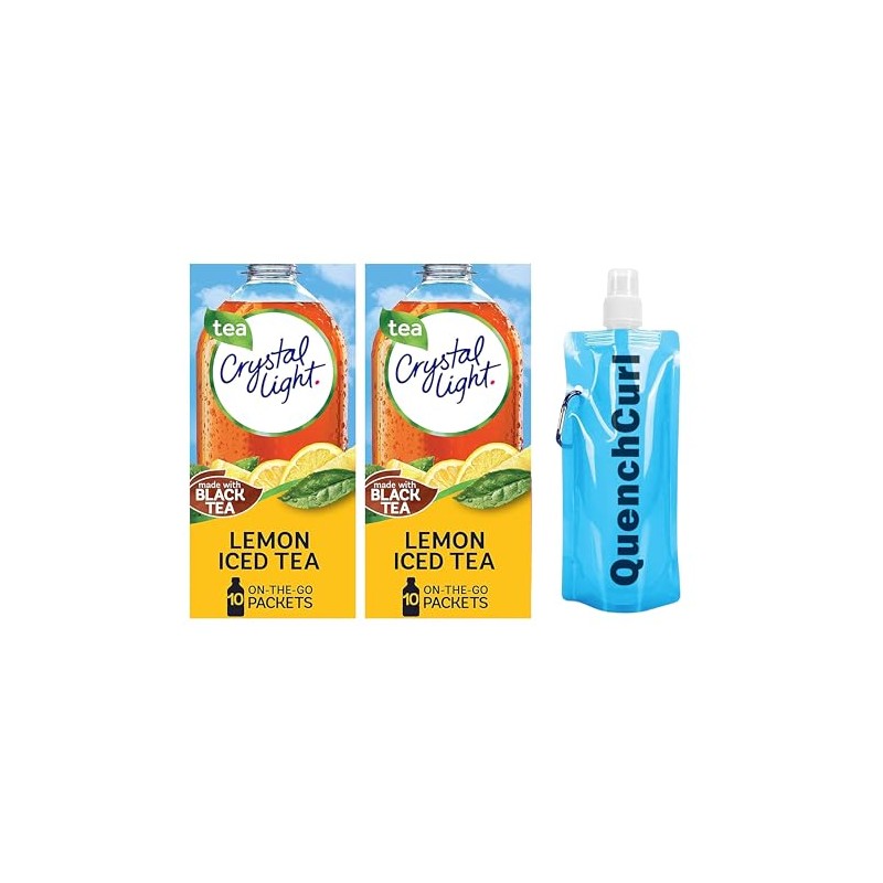 Crystal-Light On The Go Drink Mix - Two (2) Pack of 10pck/0.13oz Pouches - Sugar-Free, Low-Calorie Refreshment Anytime, Anywhere and QuenchCurl Collapsible Bottle by CureCor! (Lemon Iced Tea)