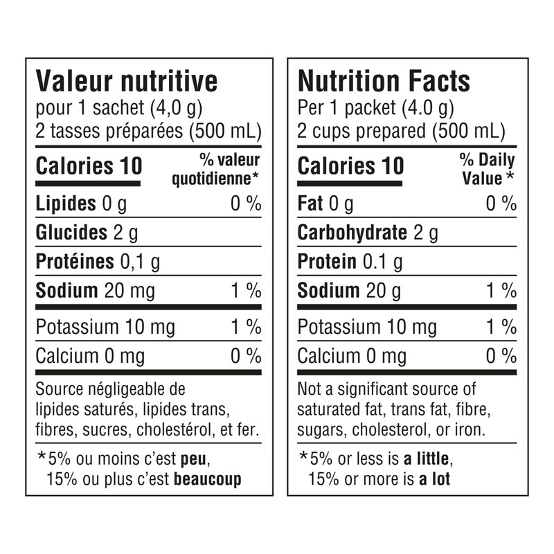 • Only 10 calories per 4.0g packet (2 cups prepared - 500mL)