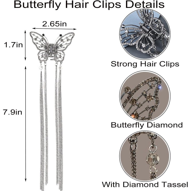 Crystal Rhinestone Metal Pearl butterfly Hair Claw Clip with Tassel - Fashion Hair Accessory for Women and Girls (Silver Gray, One Size)