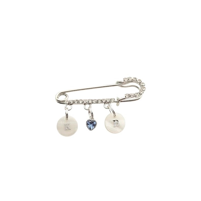 - CUSTOMIZABLE DESIGN: Beautiful silver-plated safety pin featuring personalized shell initials and a heart-shaped blue crystal charm