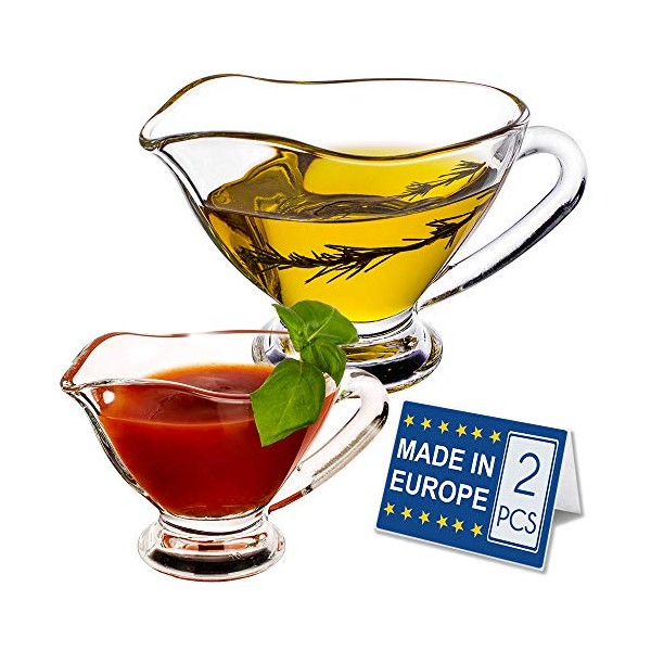 - EXCELLENT EUROPEAN QUALITY GLASS SAUCER SET: Crystalia clear glass gravy boat saucer set is made with high quality toughened European clear and smooth glass. These excellent sauce boat set are perfect for olive oil, vinegar, gravy sauce, salad dressing or other sauces.