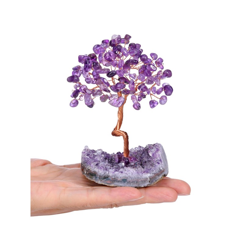 - Crystal Tree: handmade amethyst crystal stones tree copper wire wrapped on raw amethyst crystal geode cluster base, a exquisite feng shui crystal bonsai tree decoration for home /living room/ office/desk decoration, brings your wealth, happiness and good luck