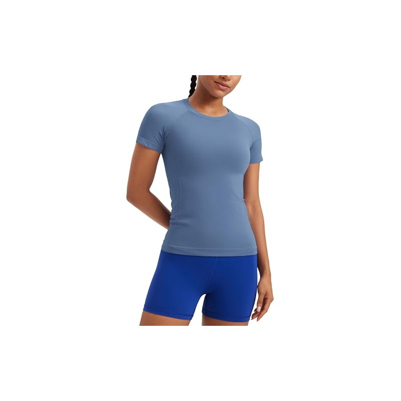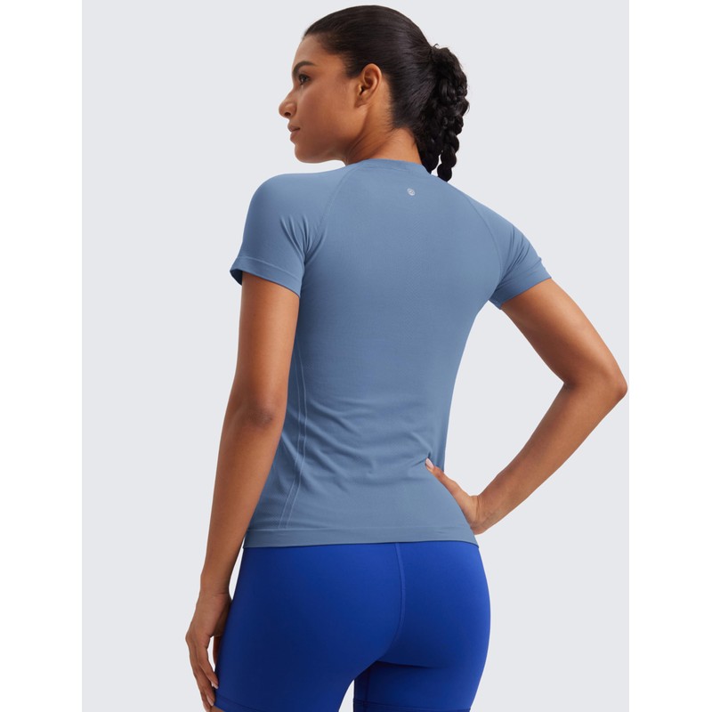 CRZ YOGA Seamless Workout Tops for Women Short Sleeve Athletic Tees Breathable Gym Running Yoga Shirts Oasis Blue Medium