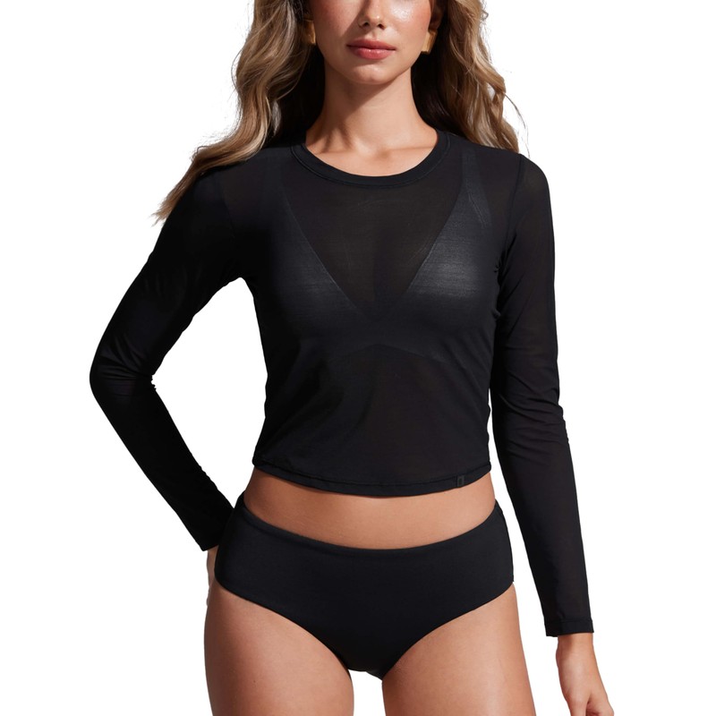 CRZ YOGA Womens Mesh Long Sleeve Swimsuit Cover Up Pullover High Neck Crop Bathing Suit Bikini Coverups Tops Black Large