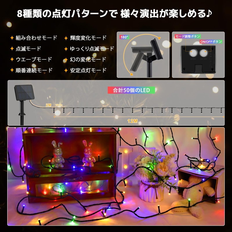 - (Various Lighting Modes) The outdoor solar light uses high quality LED bulbs, so the brightness of the light is brighter than conventional products. Each grain is bright and looks beautiful from any direction. It also realizes a perfect 360 degree diffusion luminescence. There are 8 different lighting modes, so you can easily switch between the lighting mode by pressing the "Mode" button. Creates a warm atmosphere for parties and holidays and spreads beautiful light for your garden, entryway, shop or shopping market door, bed, wall or room as you like