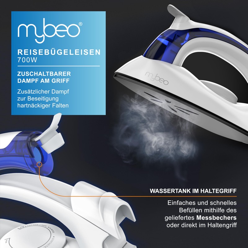 - EXTREM LEICHT UND KOMPAKT. Wozu mit einem sperrigen Gerät hantieren, wenn es auch einfacher geht: Das handliche 700 Watt Dampf-Bügeleisen von MyBeo bietet eine große Leistung, macht sich auf Reisen aber ganz klein! Einfach den faltbaren Handgriff umklappen und das innovative Gerät findet Platz in in der kleinsten Lücke. Seine Handlichkeit und das geringe Gewicht kommen beim Bügeln auch Ihren Handgelenken zugute! | 306629