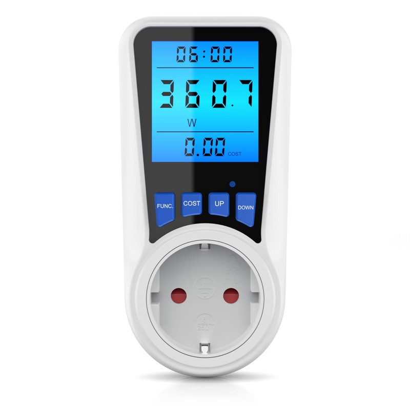- Easy real-time monitoring: plug the energy meter between the socket and the device - the current power consumption is displayed. Available in watts, kWh, price or cost per kWh. Also displayed are voltage (V), current (A), power factor (power factor) and more. The measurement data can be easily retrieved via the FUNC button. Please note: the power consumption of switched on devices is measured under load (no standby measurement!)