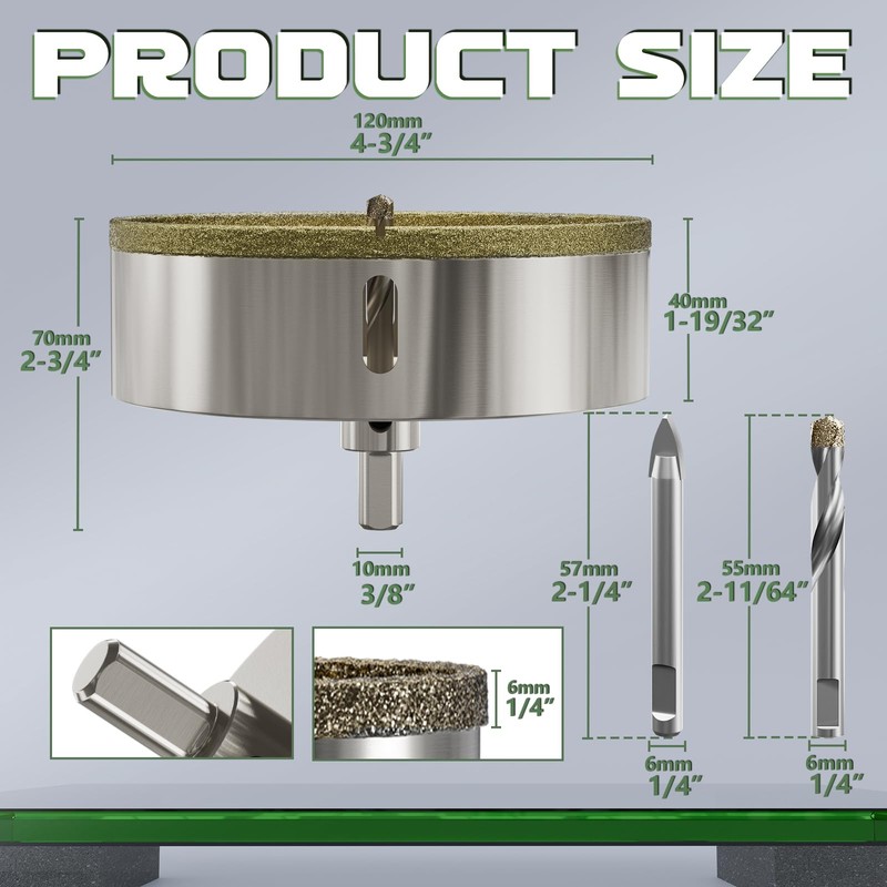 - 【SIZE】:Hole Diameter 4-3/4"(120mm),1/4"(6mm)High-grade diamond coating, total length 2-3/4"(70mm),Equipped with a pointed center drill, a flat center drill and a hexagonal wrench.