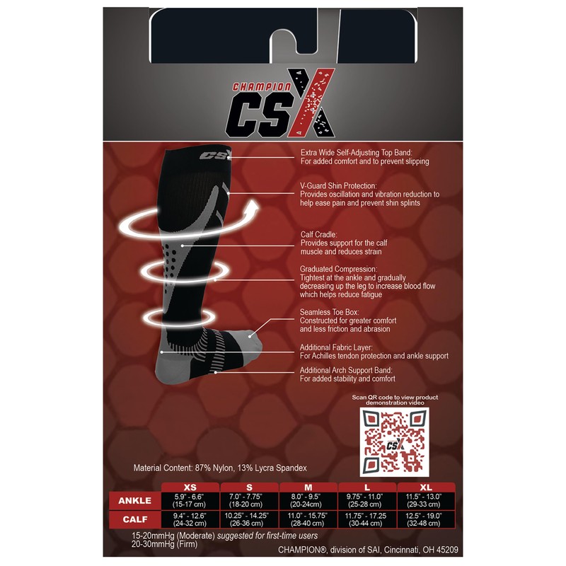 - CSX model X200 moderate strength 15-20 mmHg compression support; Knee length unisex style is anatomically designed to increase performance for athletes and active wear enthusiasts; Advanced hi-filament material wicks moisture and maximizes air flow