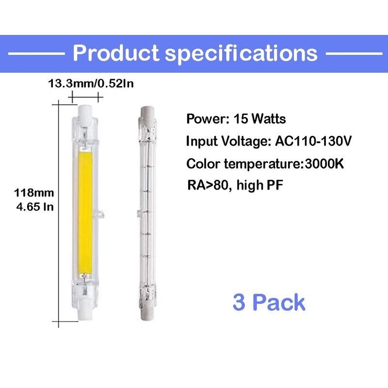 - 1.✔3-pack 15 Watt Double Ended R7S J118 LED Light Bulb /Halogen Replacement Bulb; 3000K Warm white , Dimmable, 120V Input .