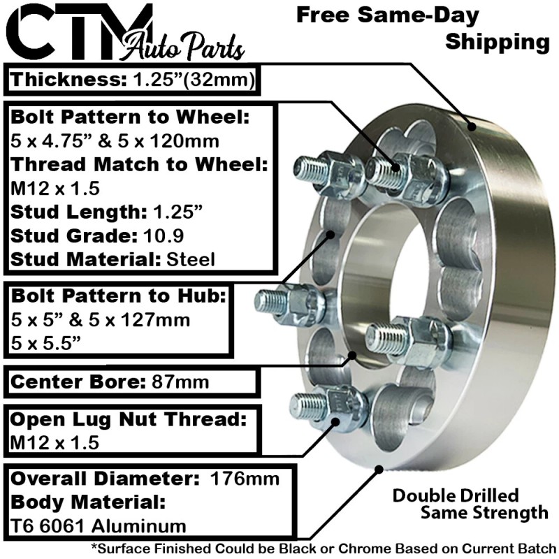 CTM 4P 1.25" THICK 5x5(127) & 5x5.5 TO 5x4.75(120) WHEEL ADAPTER SPACER M12X1.5 STUD