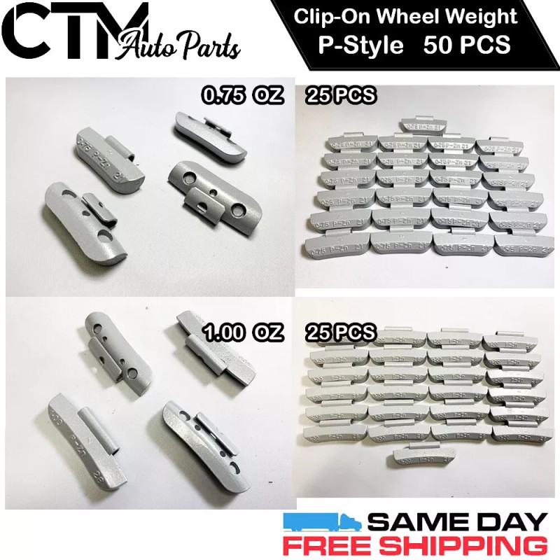 50 PCS CLIP ON WHEEL WEIGHT BALANCE P STYLE 25PC/0.75OZ 25PC/1.00OZ