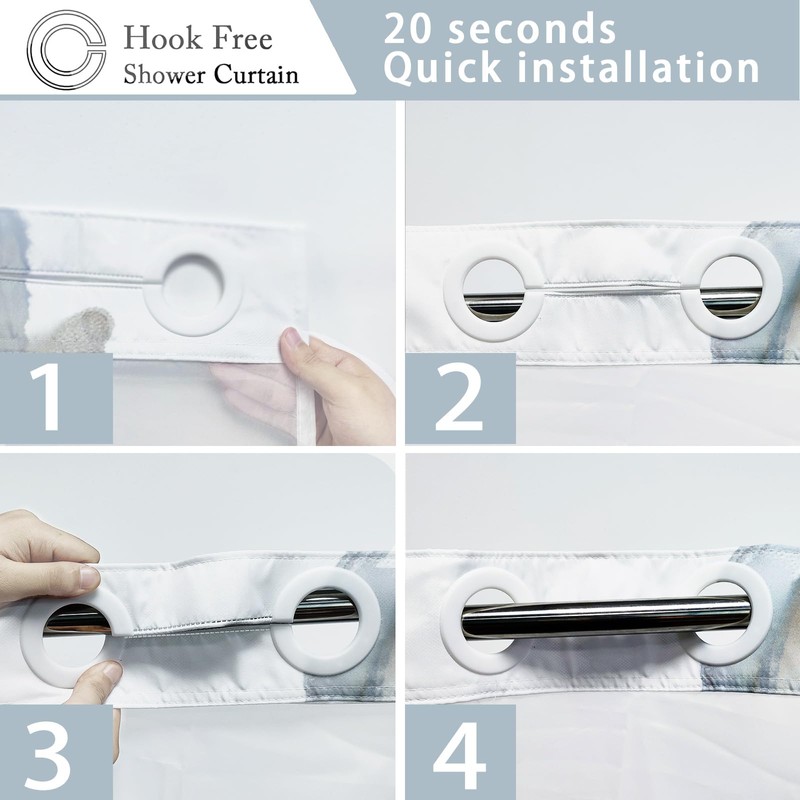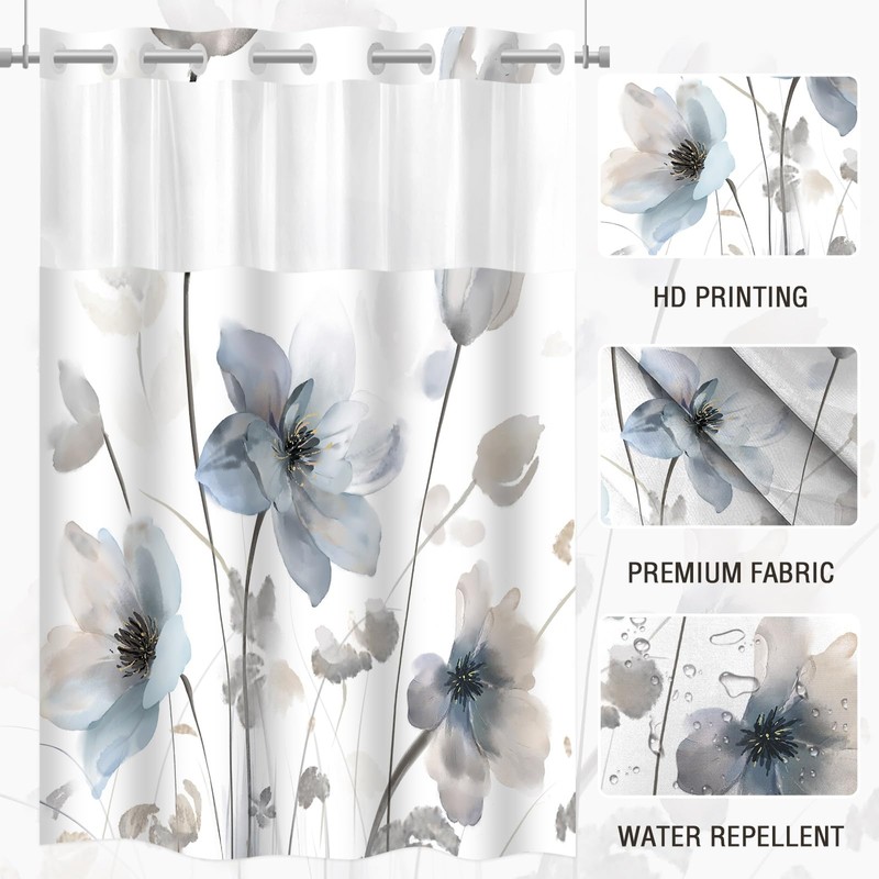 Premium No-Hook Shower Curtain Set with Snap-In Liner and See-Through Top Window Upgrade your daily routine with our thoughtfully designed shower curtain set that combines effortless functionality with elegant style. This complete 71x74-inch solution eliminates common bathroom frustrations while adding a touch of modern sophistication to your space. Effortless Installation and Use Our innovative no-hook design features built-in open grommets that slide smoothly onto any standard shower rod. The included snap-in waterproof liner securely attaches to prevent slipping and shifting, ensuring a perfect fit without constant adjustments. This practical system saves time during both installation and daily use. Natural Light Optimization The strategically placed see-through top window brightens your shower area by allowing natural light to filter through while maintaining complete privacy. This design feature is particularly beneficial for smaller bathrooms or spaces without windows, creating an airier, more open atmosphere. Timeless Aesthetic Appeal The soft watercolor floral pattern in soothing grey and blue tones creates a versatile decorative element suitable for various design styles. The artistic, slightly blurred effect complements farmhouse, traditional, and contemporary bathrooms alike, offering a cohesive look that ties your space together. Practical Maintenance Designed for real-life convenience, the entire set is machine washable using a gentle cold cycle. The quick-drying fabric and digital printing ensure your curtain maintains its like-new appearance through repeated cleanings. Complete Package Value This set includes both the decorative curtain and attached liner, eliminating the need for separate purchases. The generous 71x74-inch dimensions provide full coverage for standard tubs while the reinforced stitching at stress points enhances longevity.
