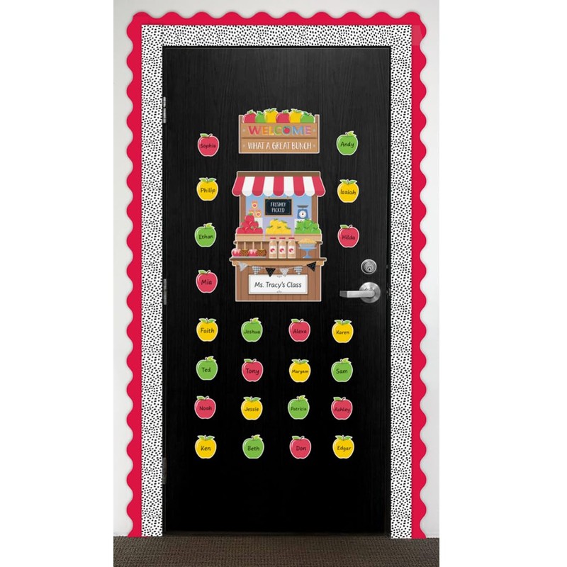 - WHAT'S INCLUDED: This 39-piece bulletin board set includes a welcome banner, 30 student apples, 1 jumbo apple, 1 apple stand with blank sign, 4 signs, and 2 mini posters.