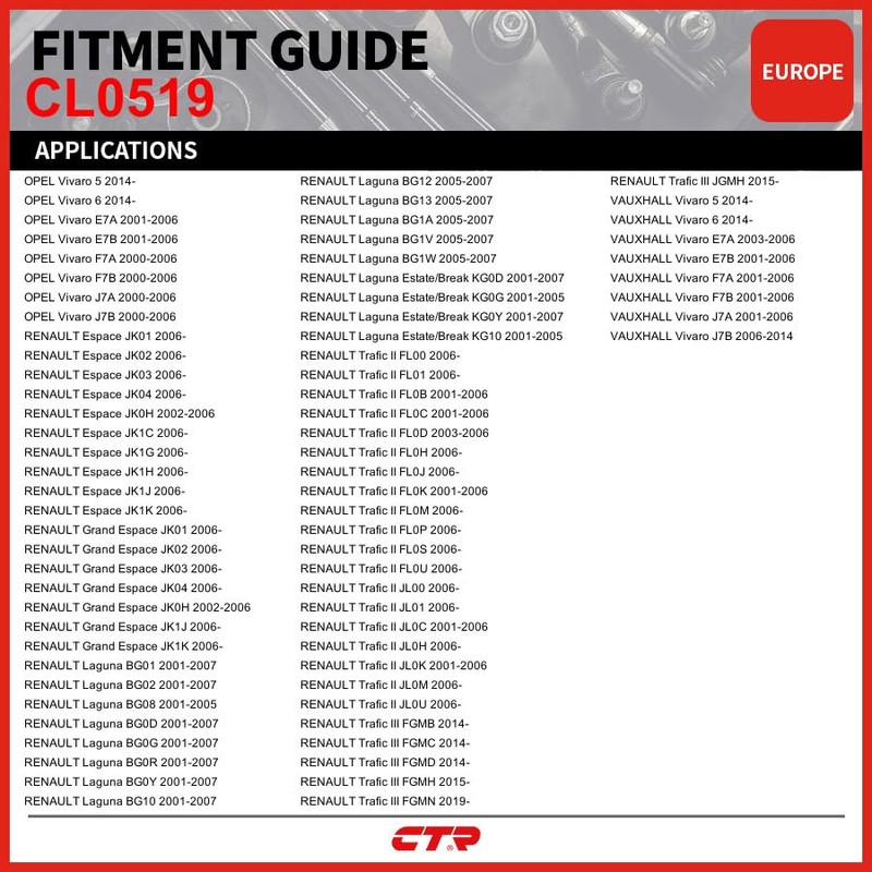 - For the European Region: Compatible with Opel Vivaro 5 2014-, 6 2014-, 3 2014-, J7A/J7B 2000-, E7A/E7B 2001-, F7A/F7B 2000-, E7B 2006-; Nissan Primastar X83 2001-; Renault Trafic Iii Jgma/Jgmc 2014-, Jgme 2014-, Jgmd 2014-, Jgmb/Jgmc 2014-, Fgma/Fgmc 2014-, Fgme 2014-, Fgmd 2014-, Fgmb/Fgmc 2014-, Egma/Egmc 2014-, Egmb/Egmc 2014-, Jgmg 2015-, Jgmj/Jgmr 2015-, Jgmh 2015-, Fgmj/Fgmr 2015-, Fgmh 2015-, Egmg 2015-, Fgmg 2015-, Egmh 2015-, Fgmk 2015-, Jgms 2019-, Jgml 2019-, Jgmm 2019-, Jgmn 2019-, E