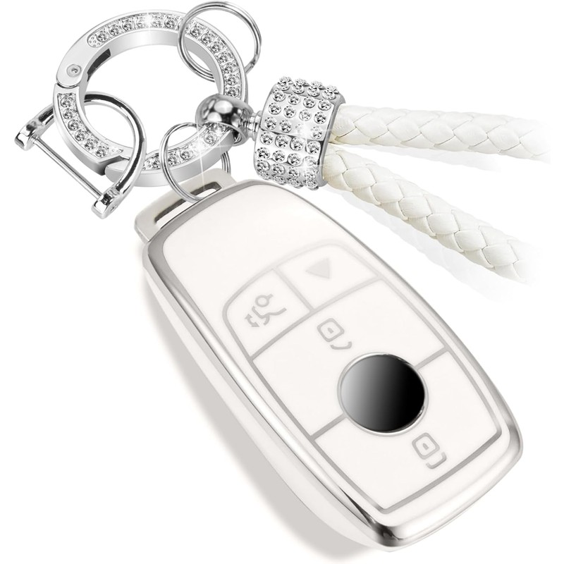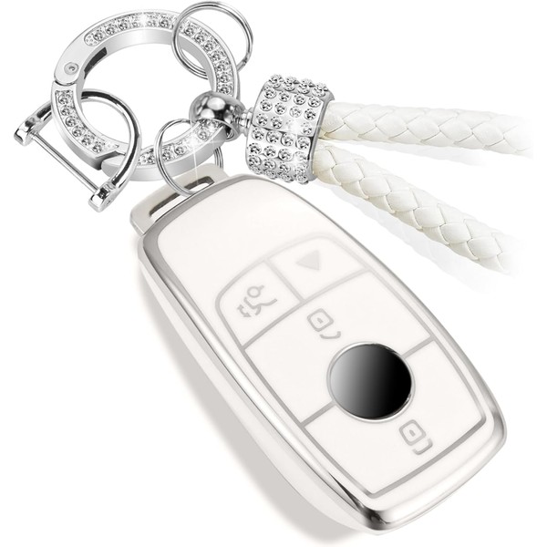 CTRINEWS for Mercedes Key Fob Cover with Luxury Diamond Braided Keychain, Upgraded Soft Case for Benz GLC GLE GLA GLB GLS AMG A C E G S Class (4 Buttons) Shell (Silver Bling,B2)