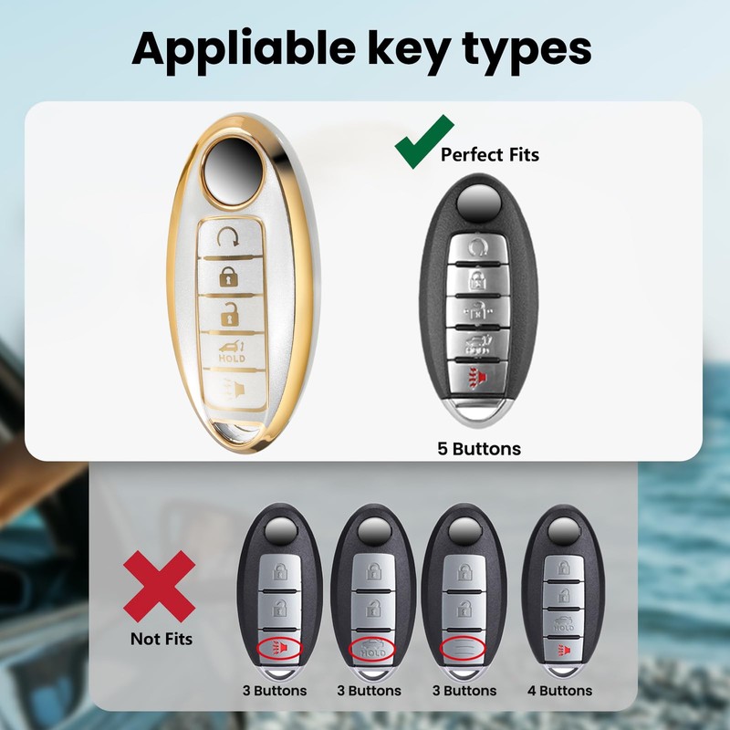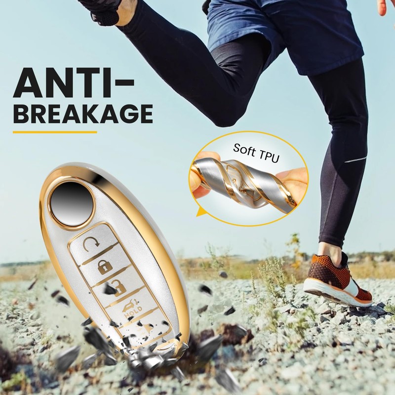 CTRINEWS for Nissan Key Fob Cover with Upgraded Anti-lost Luxury Keychains, Fashionable Matte Metallic Silver Soft Case for Altima Maxima Armada Sentra FX QX (5 Button) (Gold, A3)