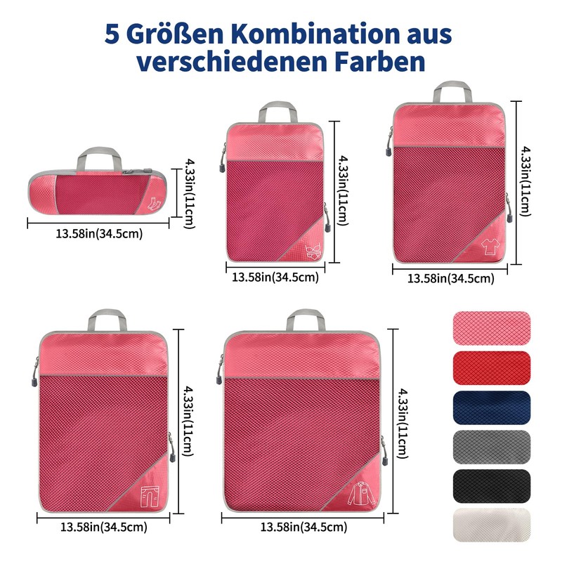 - 5-piece compression packing cubes set: equipped with 5 different sizes of suitcase organiser bags, which can be suitable for different needs and are easy to distinguish. 4 large compression cubes for suits, jackets, shirts, sweaters, trousers, 1 socks and towel bag. The travel cubes fit perfectly in most suitcases and easily store your travel accessories and gear.