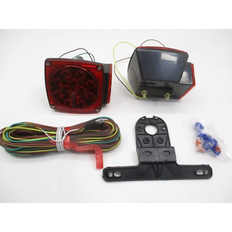 - Kit Includes: LED Tail Lights with Red Side Marker, 25' Trailer Wire Harness with 4-Way Flat Plug, Plastic License Plate Bracket, Wire Connectors and Spring Clips.