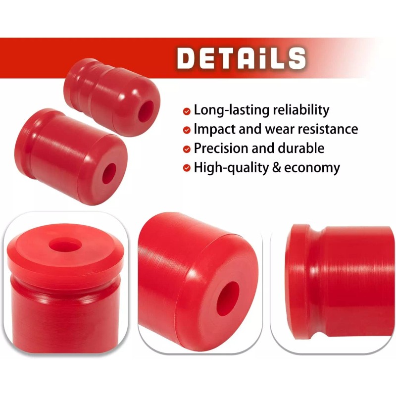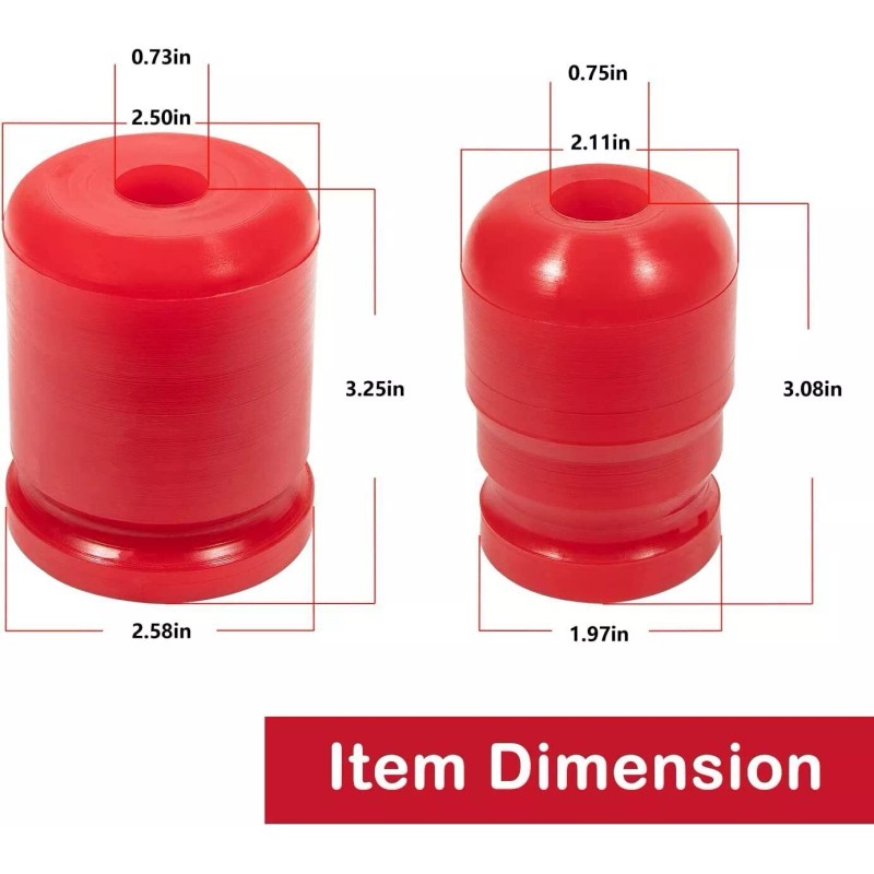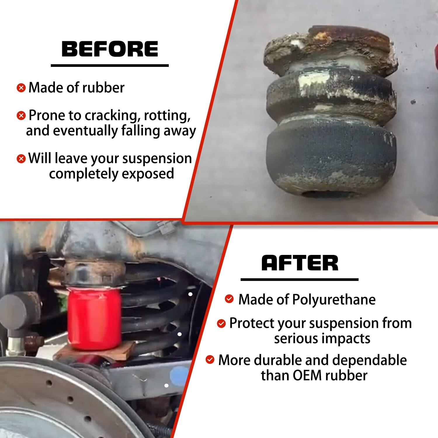 * Material: Made of high-quality polyurethane, which outperforms its rubber counterparts in replacing bushings and mounts. Bump Stops withstand road debris, chemicals, oil, compression and loads for longer life. They will perform better by eliminating the extra sloppy suspension performance caused by worn, damaged or missing bushings.