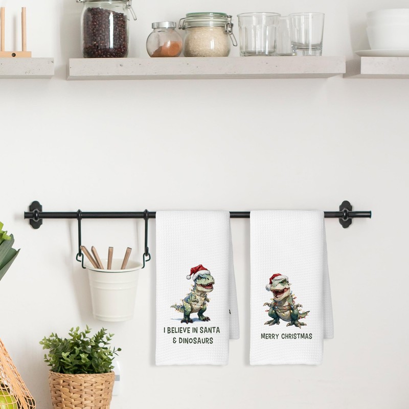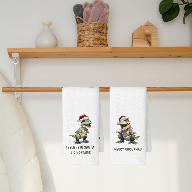 CUANFDDSF Funny Christmas Dinosaur Kids Hand Towels Set of 2, Dinosaur Gifts for Boys, Dino Merry Christmas Tea Towels Kitchen Hand Towels, Kids Boys Bathroom Decor 16x24 Inch