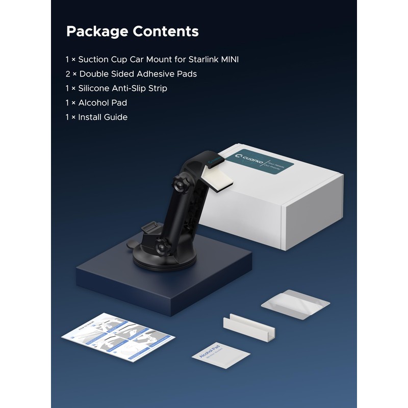- [Thoughtful Package for Every Situation] Suction Cup Car Mount for Starlink MINI *1, Double Sided Adhesive Pads *2, Silicone Anti-Slip Strip *1, Alcohol Pad *1, Install Guide *1. No tools required, making installation and removal quick and hassle-free. Its attentive design ensures a secure fit and an easy setup.