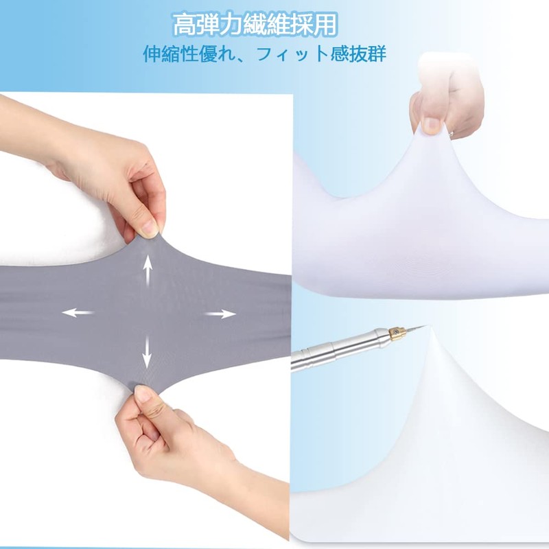 - Material Composition: 85% polyester and 15% spandex, high elastic fiber with a cooling sensation, 99% UV protection, excellent elasticity and breathability, with silicone anti-skid. Suitable for: Men's, women's, unisex, left and right 2-piece set. Sizes: S, M, L, XL. Colors: Black, white, gray, navy, blue.