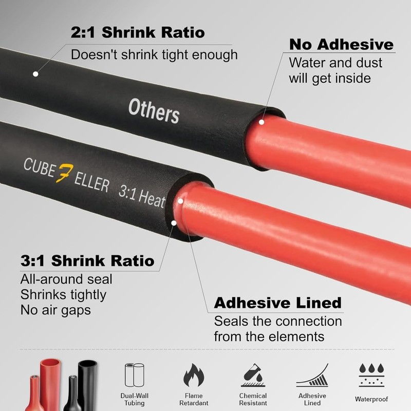 - 【DUAL WALL TUBING】 CUBEFELLER Heat Shrink Tubing adopts a double-wall design and adhesive lining. The outer wall provides extremely high abrasion resistance. While heating, the adhesive line will melt, and then it will be adsorbed on the surface of the object tightly, creating waterproof and long-lasting insulation.