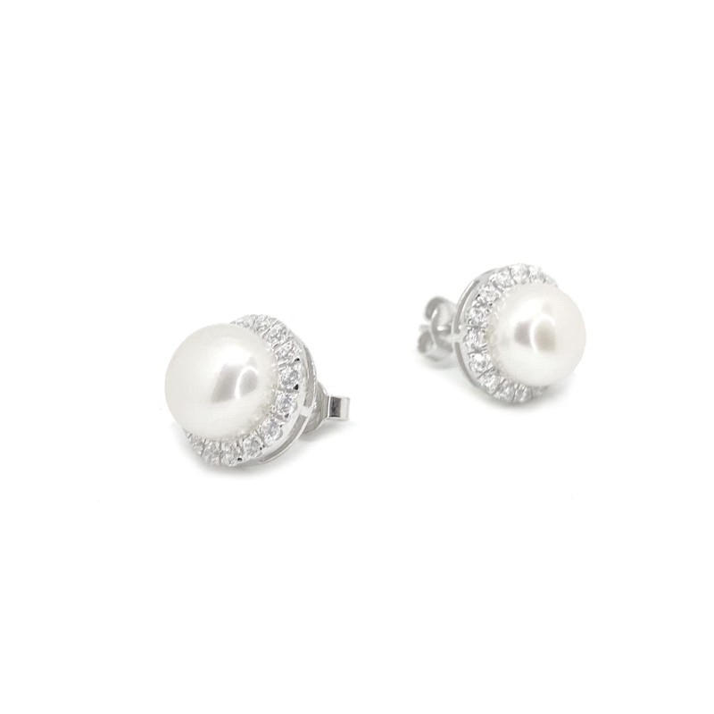 This eye-catching pearl earrings with sparkling cubic zirconium crystals is crafted from rhodium plated 925 sterling silver, marked on the reverse. A beautiful round white 9mm freshwater cultured pearl stands proud from the pretty setting, surrounded by cubic zirconium crystals to form dazzling earrings with a contemporary twist. Freshwater Cultured Pearl Pearl measures 9mm in diameter Silver butterfly backs Matching pendant available Presented in a smart gift box