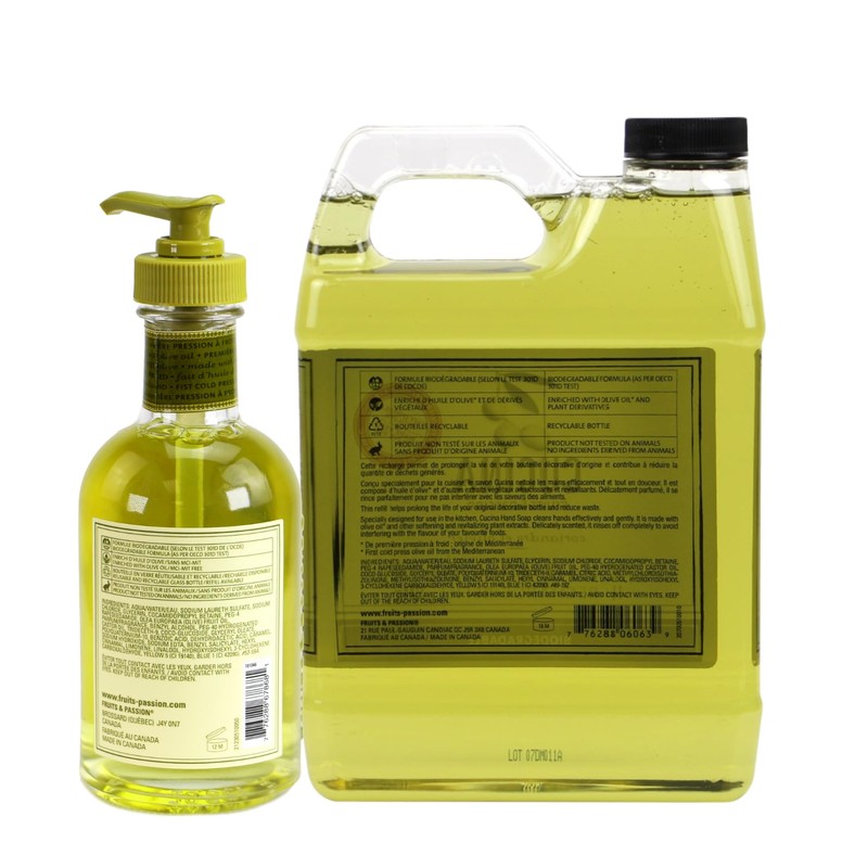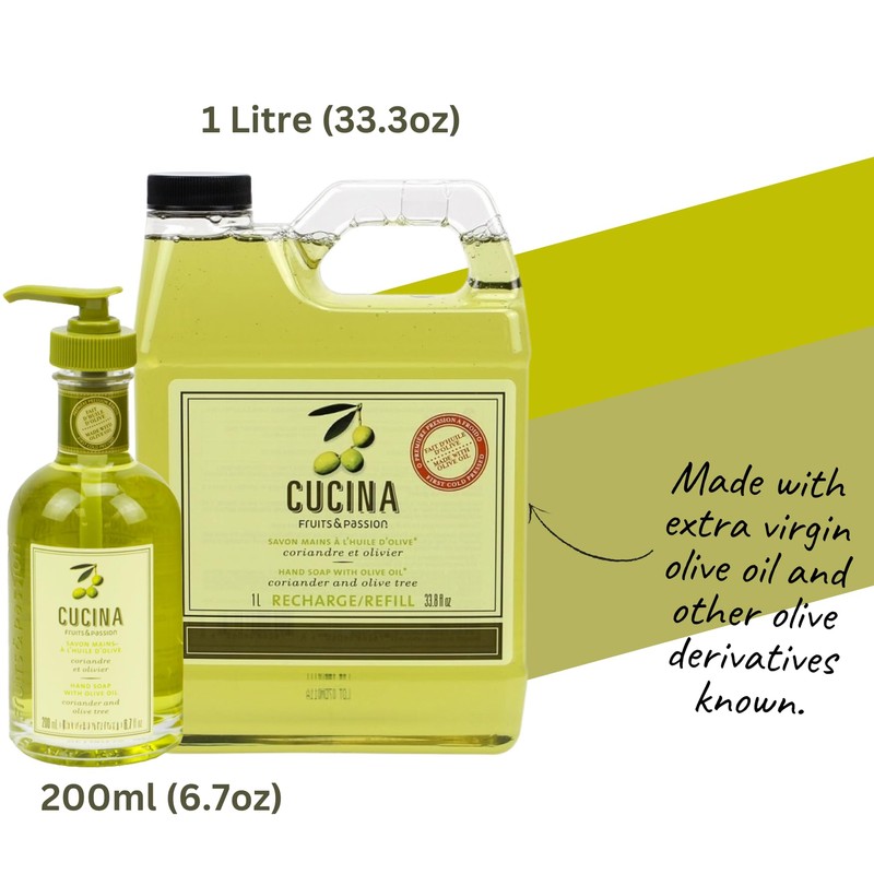 Cucina Fruits & Passion Coriander and Olive Tree Hand Soap Set, 6.7 fl oz Glass Bottle and 33.8 fl oz Refill, Made in Canada