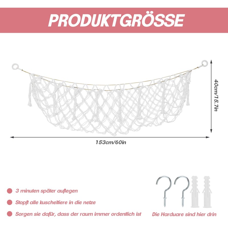 - Decorative and functional storage: In addition to the practical function as a cuddly toy net, this net also serves as a stylish decoration for the children's room, playroom or teenager's room. It blends perfectly into any room and allows you to neatly and beautifully store cuddly toys, pillows or blankets.