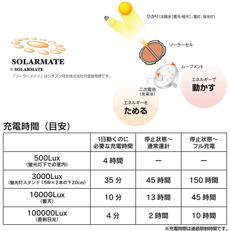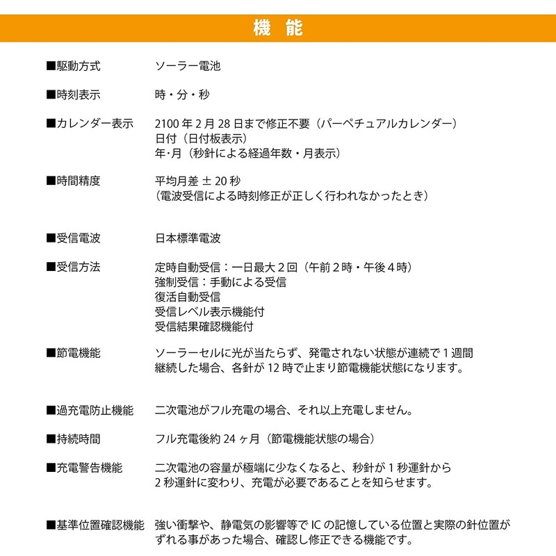 - Features: Radio reception function (Japan standard radio waves / Fukushima / Kyushu state), luminous needles, energy saving function, overcharge prevention function, charging warning function, standard position confirmation, last time when fully charged (24 months)